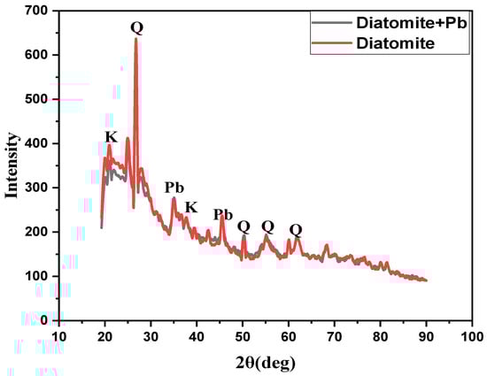 XRD patterns of pristine and Pb2+-loaded diatomite. Identified phases: α-quartz (SiO2, PDF 01-079-6236), kaolinite (Al2Si2O5(OH)4, PDF 01-083-4643), and metallic lead (Pb, PDF 01-071-6512).