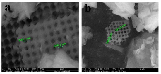 SEM analysis revealed that pristine diatomite exhibits a clean surface characterized by open pores and interconnected channels, with micropores of diverse shapes and sizes clearly visible (Figure 5). A high density of regularly ordered pores with diameters of 1–3 μm was observed, typically arranged in parallel sets and forming a honeycomb-like architecture. In addition, macropores of approximately 0.9 μm were also detected. These features highlight the heterogeneous nature of the diatomite surface, including localized clusters and partially “plugged” pores, which reflect the natural variability of its composition. After Pb2+ adsorption, pronounced morphological alterations were evident compared to the pristine material. Whereas the original diatomite displayed a porous and relatively smooth surface, the Pb2+-loaded sample exhibited partial pore filling, a rougher surface texture, and the deposition of fine particles on the pore walls and external surface. These morphological changes confirm the successful immobilization of Pb2+ ions within the diatomite matrix and the partial blockage of its pore system, thereby supporting its effectiveness as a sorbent for Pb2+ removal.