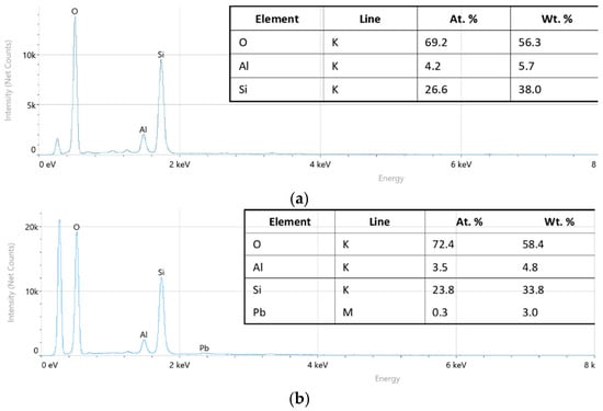 To confirm the adsorption of Pb2+ ions on the diatomite surface, an energy-dispersive X-ray (EDX) analysis with elemental mapping was carried out. The results showed that the main elements of the pristine material are oxygen (O—58.4 wt %), silicon (Si—33.8 wt %), and aluminum (Al—4.8 wt %) (Figure 6). After Pb2+ adsorption, a Pb signal of about 3.0 wt % was detected, confirming the successful fixation of lead ions on the diatomite surface.