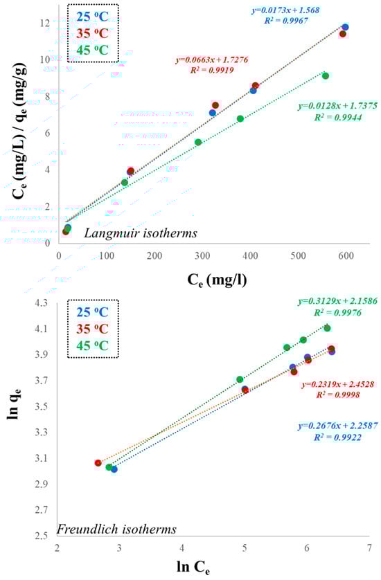 Unlike the Langmuir model, the Freundlich isotherm assumes the occurrence of multilayer adsorption on a heterogeneous adsorbent surface []. Its linearized form is expressed as: