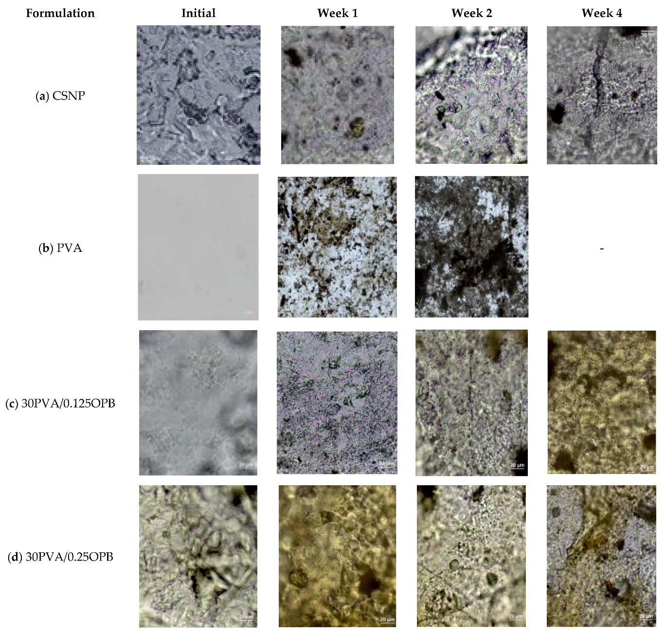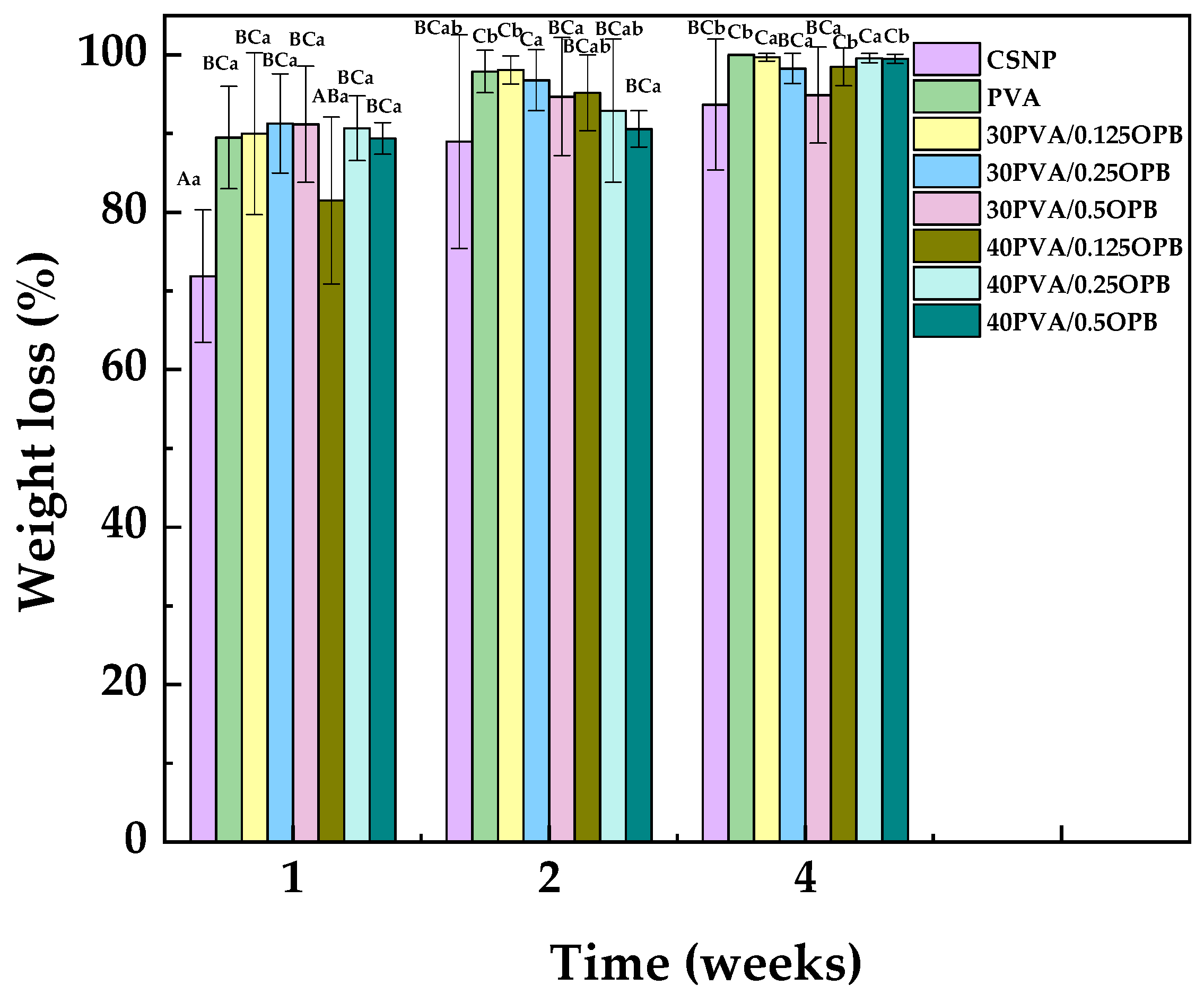 | 40PVA/0.5OPB | 9 ± 2 d | 3.585 ± 0.249 c | 12.34 ± 0.62 a | 0.72 ± 0.05 a | 9.49 ± 1.04 a |