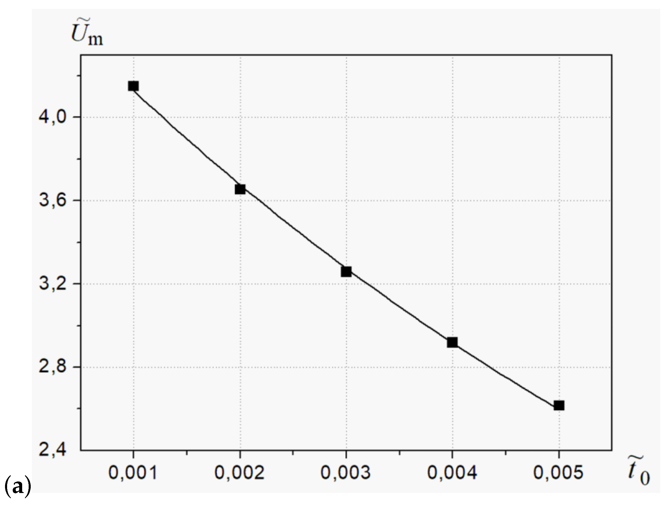 Analysis of AE signal amplitudes shows that the dependence of the maximum AE signal amplitude on the failure initiation time t ˜ 0 under the von Mises criterion exhibits a nonlinear decrease (Figure 4a) and follows a power-law relationship U ˜ m ( t ˜ 0 ) e b t ˜ 0 , with the exponent b = 115.77406 . At the same time, the dependence of the maximum AE signal amplitude on the threshold failure stress σ ˜ 0 shows a linear decrease (Figure 4b) and is proportional to the threshold stress: U ˜ m ( σ ˜ 0 ) d σ ˜ 0 , where the coefficient d = 55.74186 .