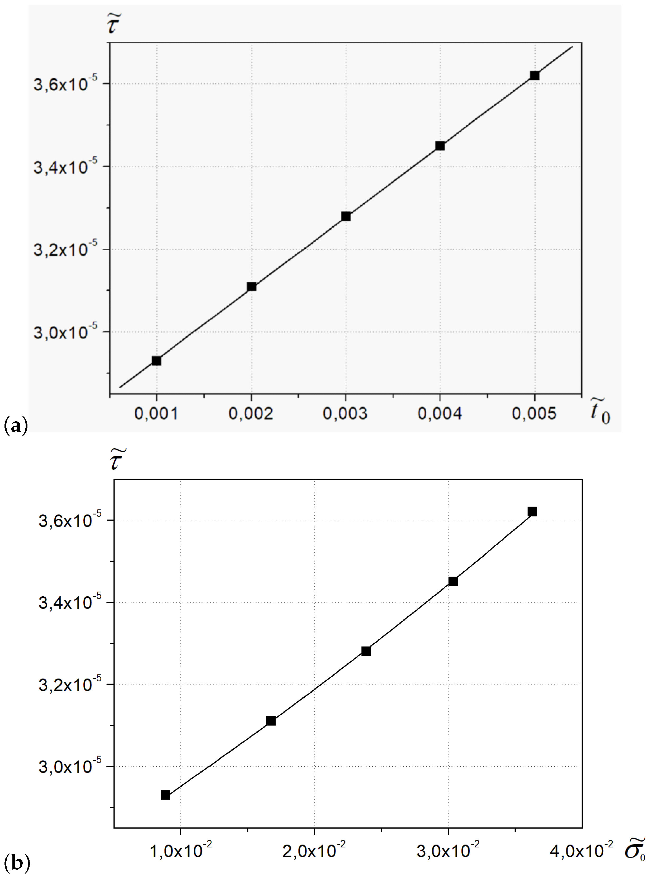 Processing of the simulation results also revealed that the dependence of AE signal duration on the failure initiation time t ˜ 0 under the von Mises criterion is linear (Figure 5a) and increases proportionally with initiation time: τ ˜ ( t ˜ 0 ) q t ˜ 0 , where the coefficient q = 0.00172 . At the same time, the dependence of AE signal duration on the threshold failure stress σ ˜ 0 is nonlinear (Figure 5b) and follows a power-law relationship τ ˜ ( σ ˜ 0 ) e θ σ ˜ 0 , with the exponent θ = 7.70732 .