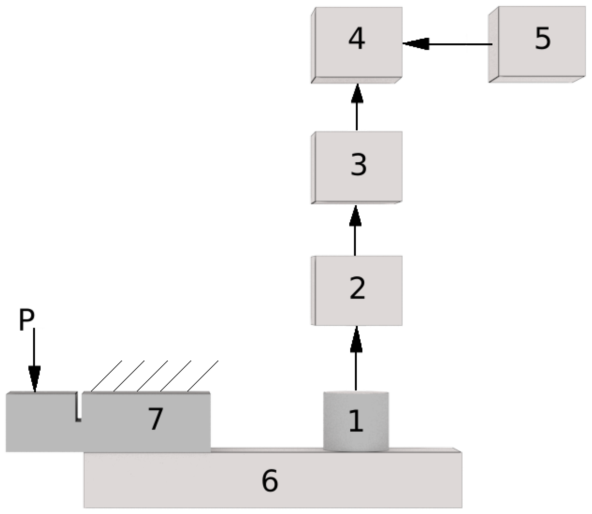 Figure 6. Schematic diagram of the experimental setup for AE monitoring during shear testing: 1—AE sensor; 2—preamplifier; 3—analog-to-digital converter (ADC); 4—personal computer; 5—acquisition/processing software; 6—specimen mounting support; 7—test specimen; P—applied transverse force.