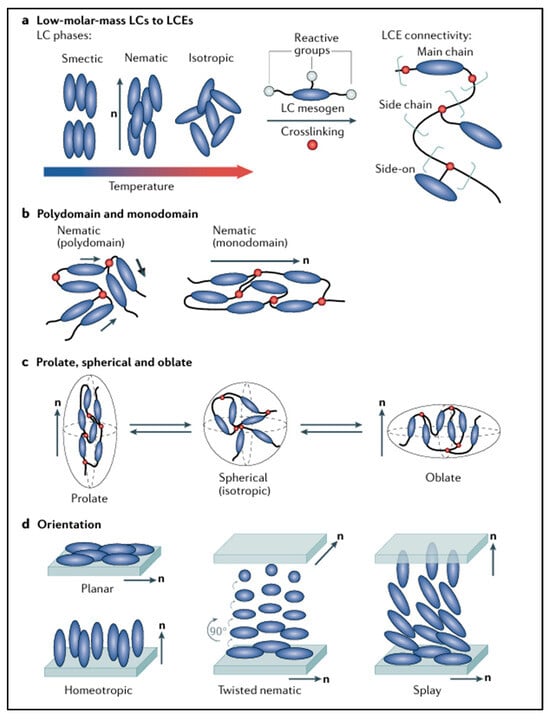 - Jiang, Z.-C.; Liu, Q.; Xiao, Y.-Y.; Zhao, Y. Liquid Crystal Elastomers for Actuation: A Perspective on Structure-Property-Function Relation. Prog. Polym. Sci. 2024, 153, 101829. [Google Scholar] [CrossRef]