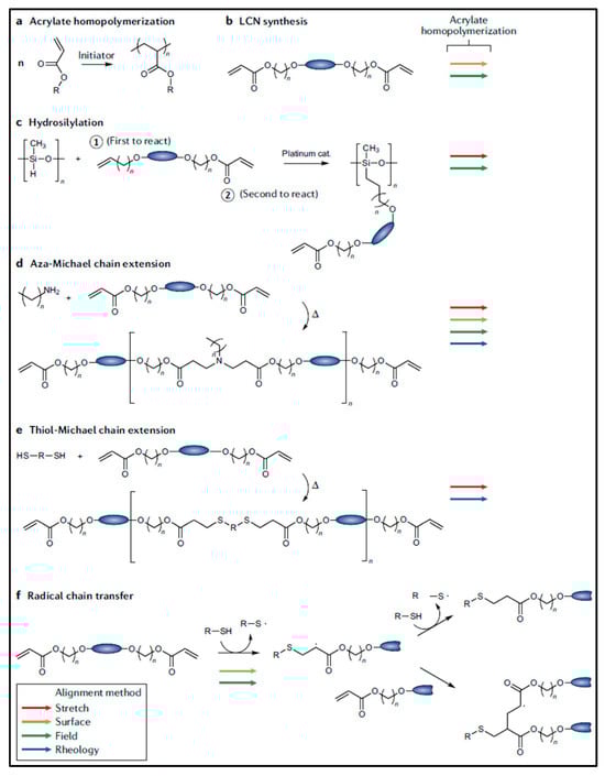 Synthetic approaches for the preparation of crosslinked liquid crystalline polymers: (a) A photoinitiated acrylate homopolymerization to prepare LCNs (b) Synthesis of LCNs, (c) Aligned liquid crystalline elastomers are prepared by the two-step ‘Finkelmann method’, comprising a platinum-catalyzed hydrosilylation, and followed by a photoinitiated radical crosslinking polymerization, (d) aza-Michael oligomerization and successive photo, (e) thiol-Michael chain extension and subsequent crosslinking photopolymerization of residual groups (stretch and rheological alignment), and (f) a radical chain transfer reaction (surface and field alignment). Reproduced with permission from Springer Nature [].