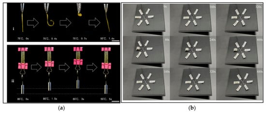 (a): (i) Photograph of reversible bending deformation process of a printed strip upon heating and cooling. During heating and cooling processes between 50 and 75 °C, bending−extension deformation behavior was observed. Scale bar: 4 mm. (ii) Photograph of weight-lifting of a printed double-layer strip (0.02 g). A weight of 12.56 g attached to the strip can be lifted up for 7 mm reversibly upon heating and cooling. Scale bar: 10 mm. Reprinted with permission from []. 2019, American Chemical Society. (b) Multilegged controllable deformation soft robot: Physical image of the soft robot moving on a 20° inclined plane in single-foot actuation mode [].