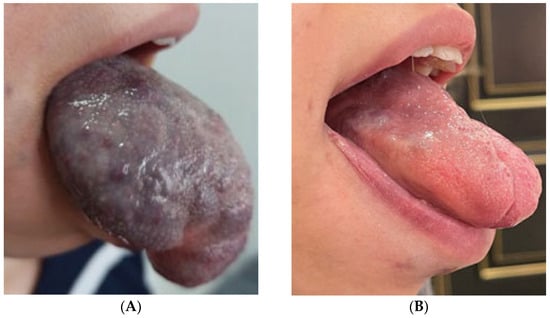 Venous malformation (VM) of the tongue. (A)—pre-treatment appearance. (B)—post-treatment appearance after 12 sessions of combined bleomycin-polidocanol foam sclerotherapy, demonstrating a complete response.