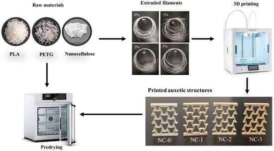 To prepare PLA, PETG, and nanocellulose for nanocomposite fabrication, all components were pre-dried in a vacuum oven at 60 °C for 24 h to remove residual moisture, as illustrated in Figure 1.