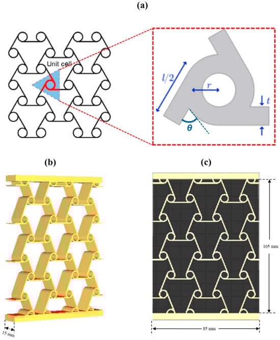 Schematic sketch of the unit cells for the anti-trichiral auxetic structure, illustrating the geometric parameters. The parameter r represents the mean radius of the circular node, l/2 denotes half the ligament length, and t indicates the ligament thickness (a) 3D design (b), and dimensions of the anti-trichiral auxetic structure specimen (c).