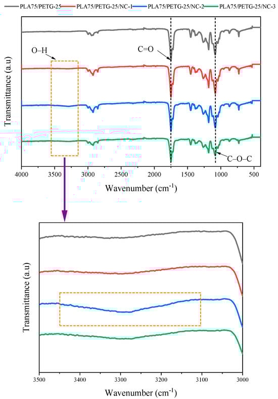 The structural features and chemical interactions of PLA/PETG blends with different amounts of nanocellulose (NC) are depicted in the FTIR spectrum shown in Figure 3. Key functional groups that correspond to the polymer matrix and nanocellulose are visible in the spectrum data, which sheds light on how they interact.
