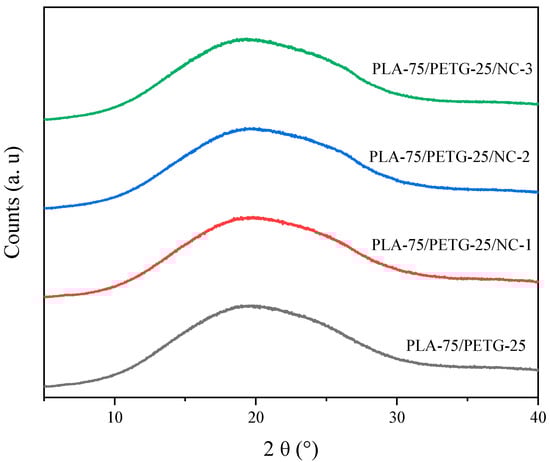 In summary, the XRD analysis demonstrates that while nanocellulose marginally enhances structural organization in PLA/PETG blends, it does not change their amorphous nature or introduce new crystalline phases, consistent with previous findings in PLA/NC nanocomposites.