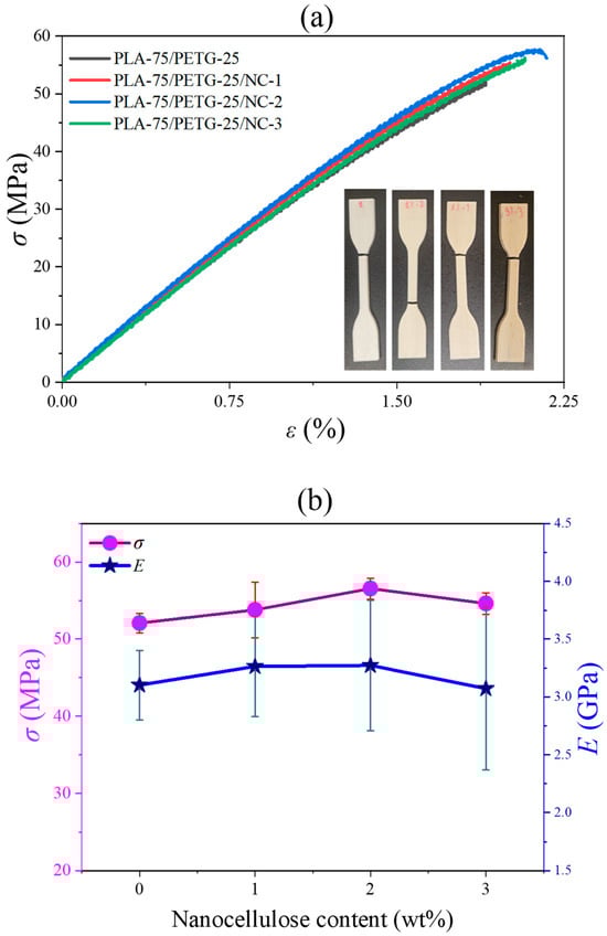 Mechanical properties of PLA/PETG nanocomposite with different nanocellulose content (a) stress–strain curves and (b) comparison of ultimate tensile strength (σ) and elastic modulus (E) for PLA-75/PETG-25 blends with varying nanocellulose (NC) content.