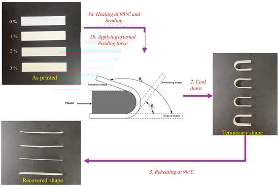 Three U-shaped 3D-printed samples per composition measuring 100 mm × 20 mm × 1 mm and printed at a 0° orientation were subjected to shape programming and recovery tests to evaluate their shape memory properties. The samples were first heated to the designated programming temperature (Tp) and then deformed to fit a 20 mm-thick mold. While held in the mold, they were cooled to room temperature to stabilize the temporary shape. After cooling, the mold was removed, and the fixed angle (θfixed) was measured to quantify the shape fixation stage.