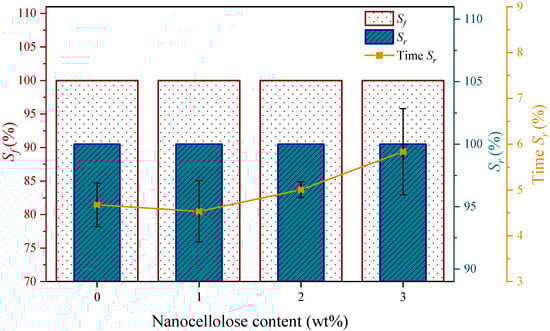 The impact of nanocellulose content on form fixity (Sf), shape recovery (Sr), and shape recovery time can be observed in Figure 7. Nanocellulose content has no detrimental effect on the material’s capacity to hold and regain its shape because shape fixity and recovery are always 100%. This implies that for all evaluated compositions, the polymer matrix offers adequate structural integrity and flexibility. The small difference in shape recovery time, however, suggests that the concentration of nanocellulose affects recovery speed but has no effect on recovery capabilities. This pattern may be explained by how nanocellulose alters the matrix’s viscoelastic characteristics, which in turn alters how responsive it is to outside stimuli.