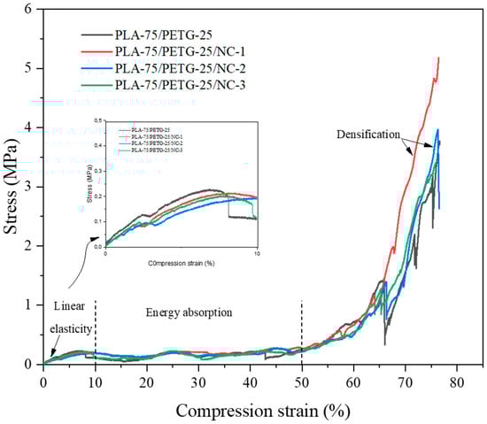 The compression behavior of anti-tri-chiral auxetic structures based on PLA-75/PETG-25 reinforced with 0, 1, 2, and 3 wt% nanocellulose was analyzed in different stages, focusing on mechanical performance and energy absorption as shown in Figure 8. Both the tabulated data and the associated stress–strain curves can be used to analyze the mechanical response of 3D-printed anti-tri-chiral auxetic structures. The findings point to three primary stages of deformation: elastic deformation, buckling and auxetic behavior, and densification.