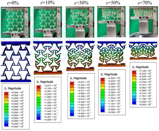 The experimental deformation and the finite element modeling (FEM) using Abaqus (Figure 10) of an anti-tri-chiral auxetic structure made from a PLA/PETG (75/25) polymer blend under progressive compressive strain ranging from 0% to 70% are contrasted in the accuracy of the numerical model in the initial, unloaded state is confirmed by the fact that both the experimental and simulated structures show very little stress at 0% strain. The auxetic behavior is demonstrated by the central nodes’ rotation and lateral contraction for strains of 10% and 30%. These deformation patterns are well captured by the simulation, which shows corresponding stress concentrations at the ligament junctions, primarily highlighted in green and yellow. At higher strain levels (50% and 70%), the structure exhibits pronounced central compression, while the outer boundaries remain relatively intact. While the simulations capture the general trends of stress concentration particularly the localization in triangular nodes and curved ligaments indicated by orange and red zones; They tend to predict a more symmetric deformation pattern than what is observed experimentally. This discrepancy likely stems from real-world imperfections such as slight geometric irregularities, uneven material distribution, or frictional effects during testing, which are not accounted for in the idealized finite element model. These asymmetries in the experimental response may also contribute to the descending stress peaks observed in the densification region of the compression curves (Figure 8), as local instabilities or asymmetric unit cell collapse trigger sudden stress drops. Nonetheless, the simulations remain valuable in qualitatively predicting local stress distribution and overall deformation behavior, in agreement with previous FEM validations for auxetic designs [60]. Similarly, the model’s predictive capability aligns with observations from Zhou et al. [61], confirming its relevance for guiding the design and optimization of complex auxetic structures, despite some limitations in capturing experimental asymmetries.