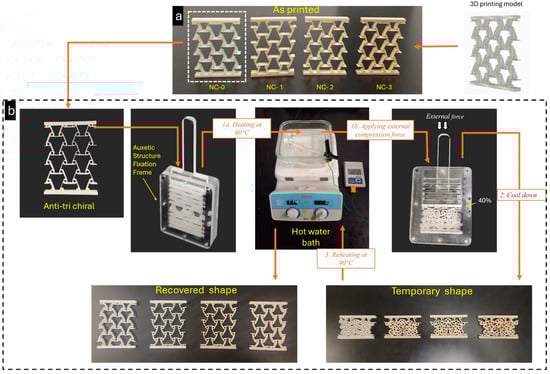 Shape memory process of Tri-Chiral auxetic structures reinforced with nanocellulose. (a) 3D printed Tri-chiral auxetic structures based on PLA-75/PETG-25 polymer blend reinforced with 1, 2, and 3 wt% of nanocellulose. (b) Shape memory programming and recovery process: The auxetic structure is placed in an Auxetic Structure Fixation Frame and heated above the glass transition temperature (T > Tg, 90 °C) in a hot water bath while an external force is applied to deform the structure. After cooling, the temporary shape is maintained. Upon reheating at 90 °C, the structure recovers its original form, demonstrating its shape memory behavior.
