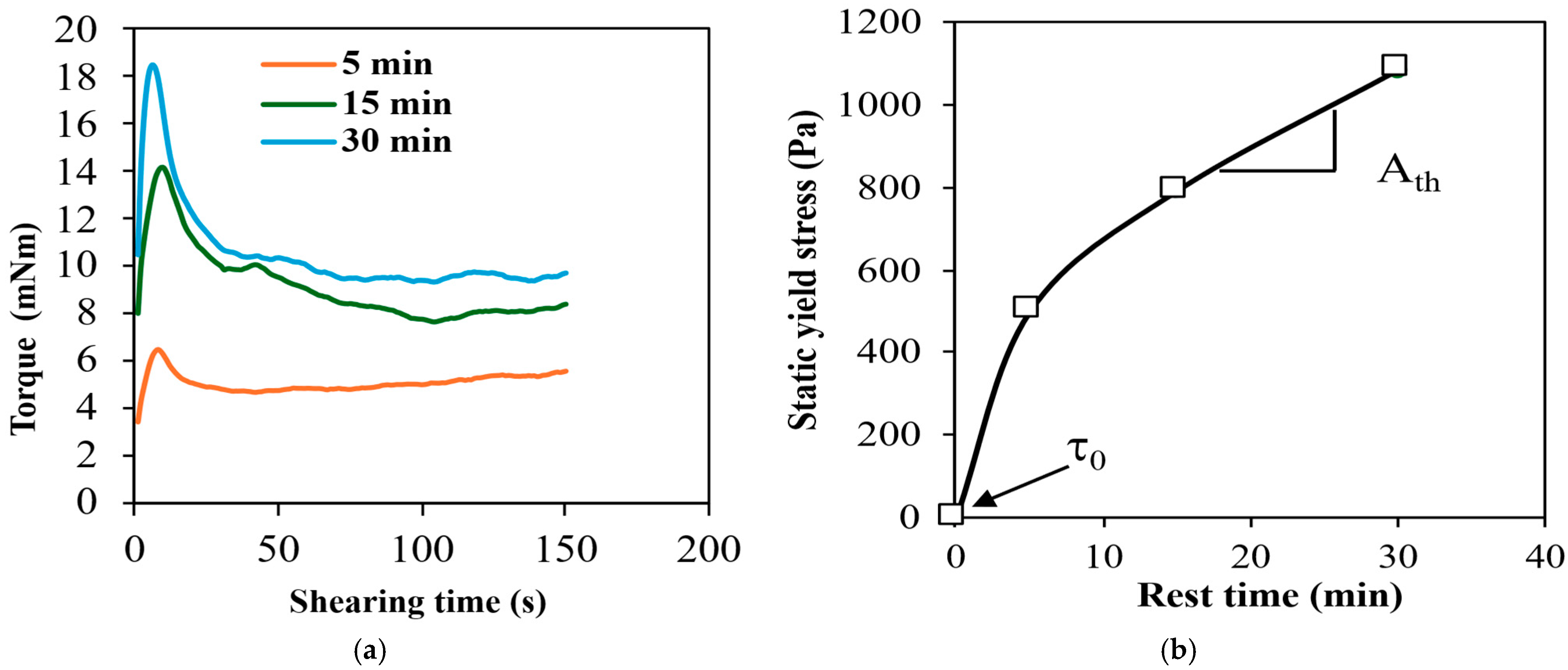 - Qian, Y.; De Schutter, G. Enhancing Thixotropy of Fresh Cement Pastes with Nanoclay in Presence of Polycarboxylate Ether Superplasticizer (PCE). Cem. Concr. Res. 2018, 111, 15–22. [Google Scholar] [CrossRef]