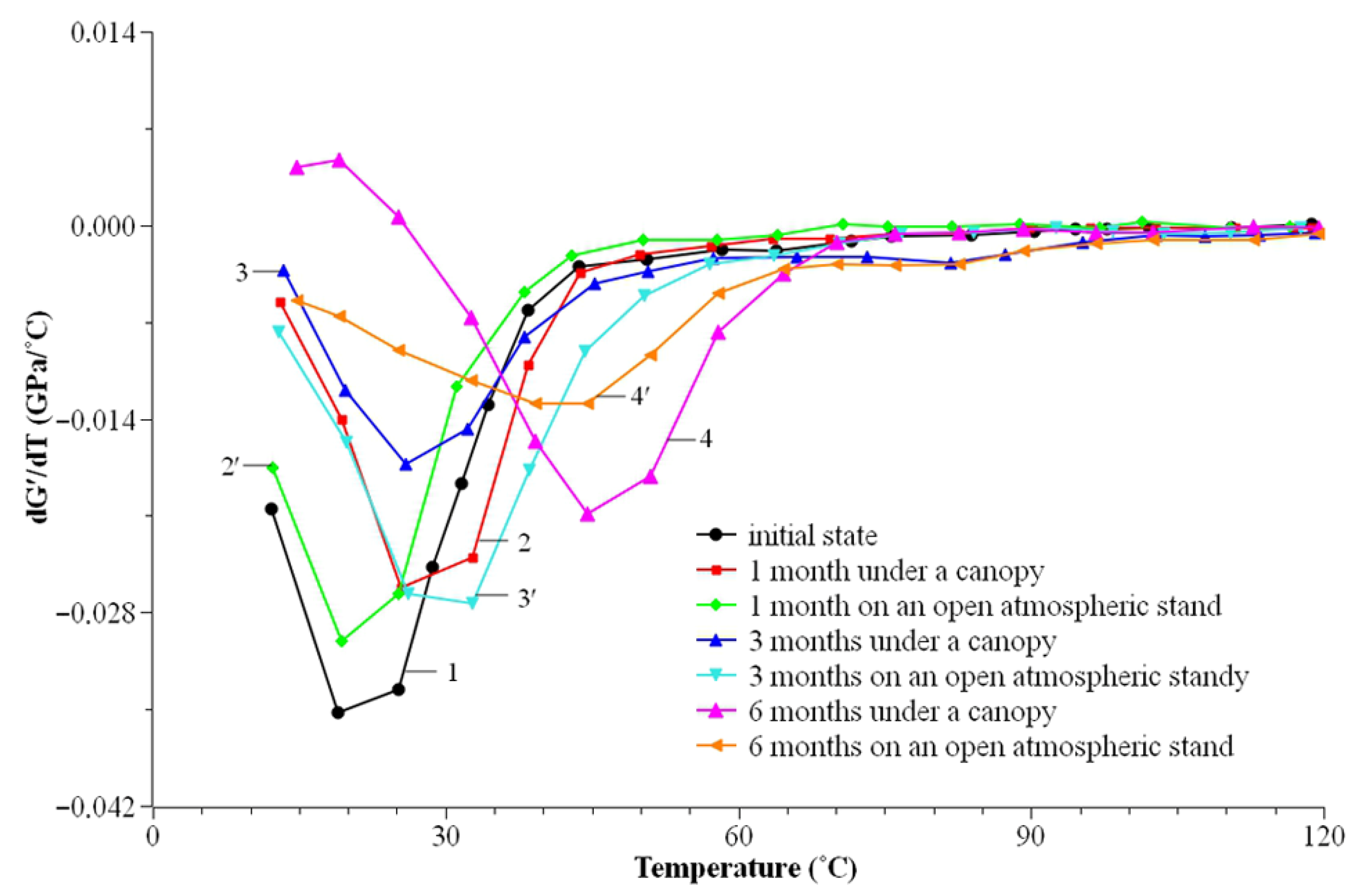 Figure 1. Temperature dependences of dG′/dT of the paint-and-varnish coating based on ED-20 resin and AF-2 hardener applied to wood, in the initial state (1) and after exposure for 1 month (2, 2′), 3 months (3, 3′), and 6 months (4, 4′) under a canopy (2, 3, 4) and on an open atmospheric stand (2′, 3′, 4′) [47].