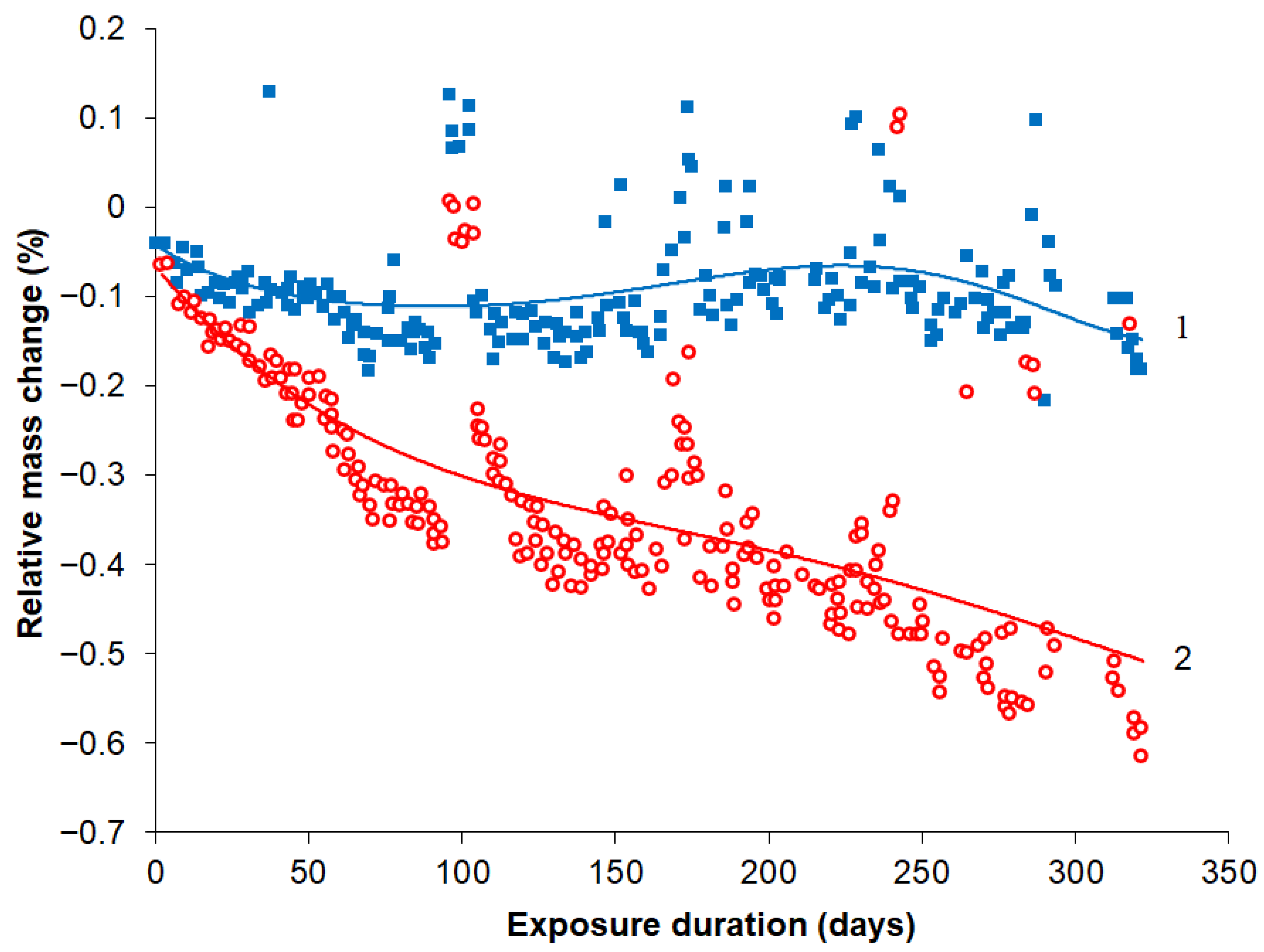 Figure 3. Dependence of the relative mass change in fiberglass plastic plates on the duration of exposure at an open-air stand in the moderately warm climate of Gelendzhik: VPS-48/7781 with paint-and-varnish coating VE-69 (curve 1); VPS-48/7781 without a protective coating (curve 2); solid lines—approximation by a 6th degree polynomial.