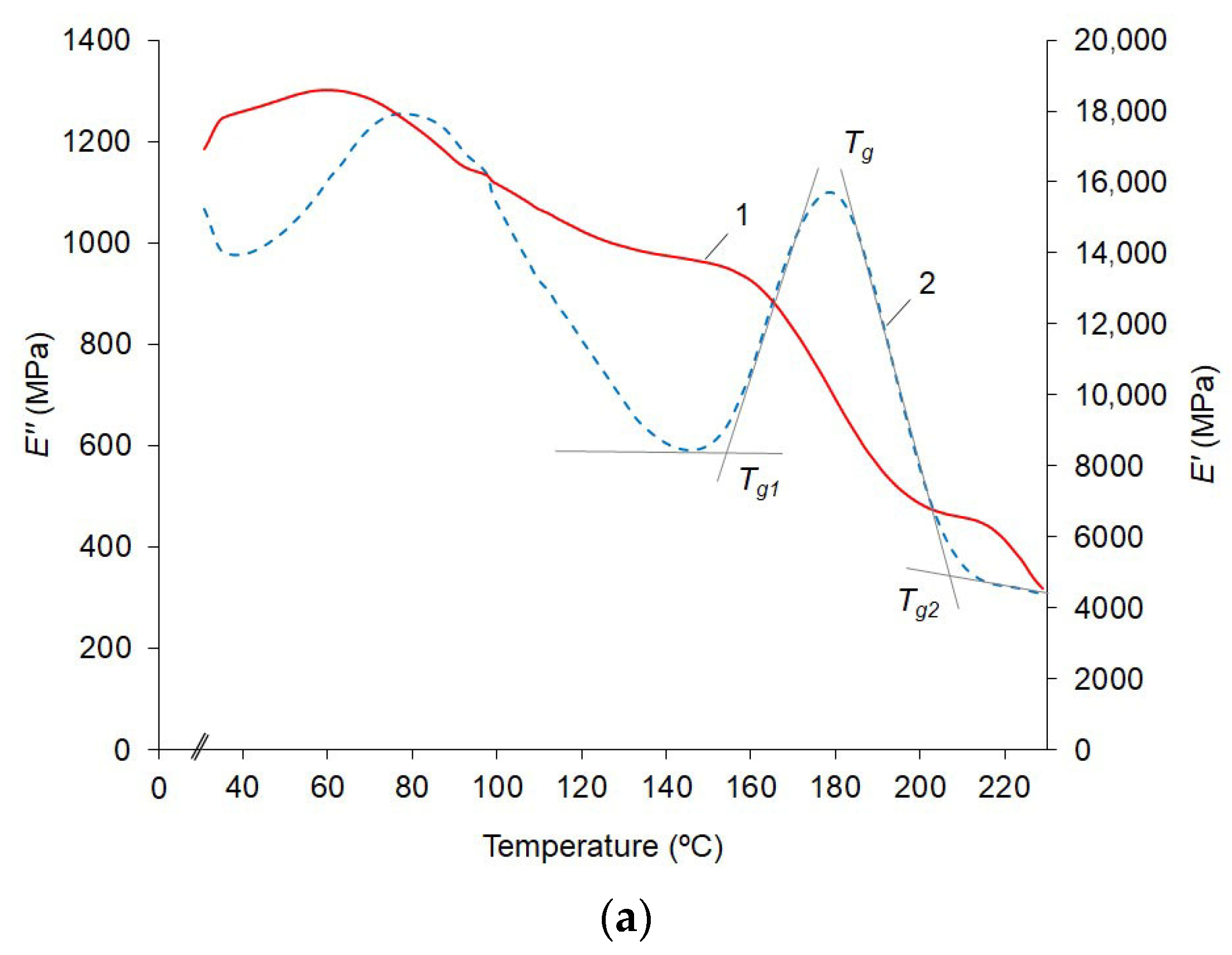 Using the recommendations of ISO 6721 [68] and their implementation, Melnikov et al. [69] determined the characteristic temperatures of the identified relaxation regions. From the dependence E′(T) presented in Figure 4a, the lower (Tg1) and the upper (Tg2) boundaries of the α transition were determined as the intersection points of the baselines and lines extrapolating the linear change in the dynamic modulus of elasticity at the beginning and end of the transition of the epoxy matrix from a glassy state to a highly elastic one [69]. Similarly, the same temperature transitions were based on the dependence E″ (T) in Figure 4b. In addition to Tg1 and Tg2, the glass transition temperature Tg was defined as the temperature corresponding to the maximum value of the dynamic loss modulus. Ideally, these characteristic temperatures obtained from the two methods should coincide; however, small differences arise due to experimental errors and extrapolation.