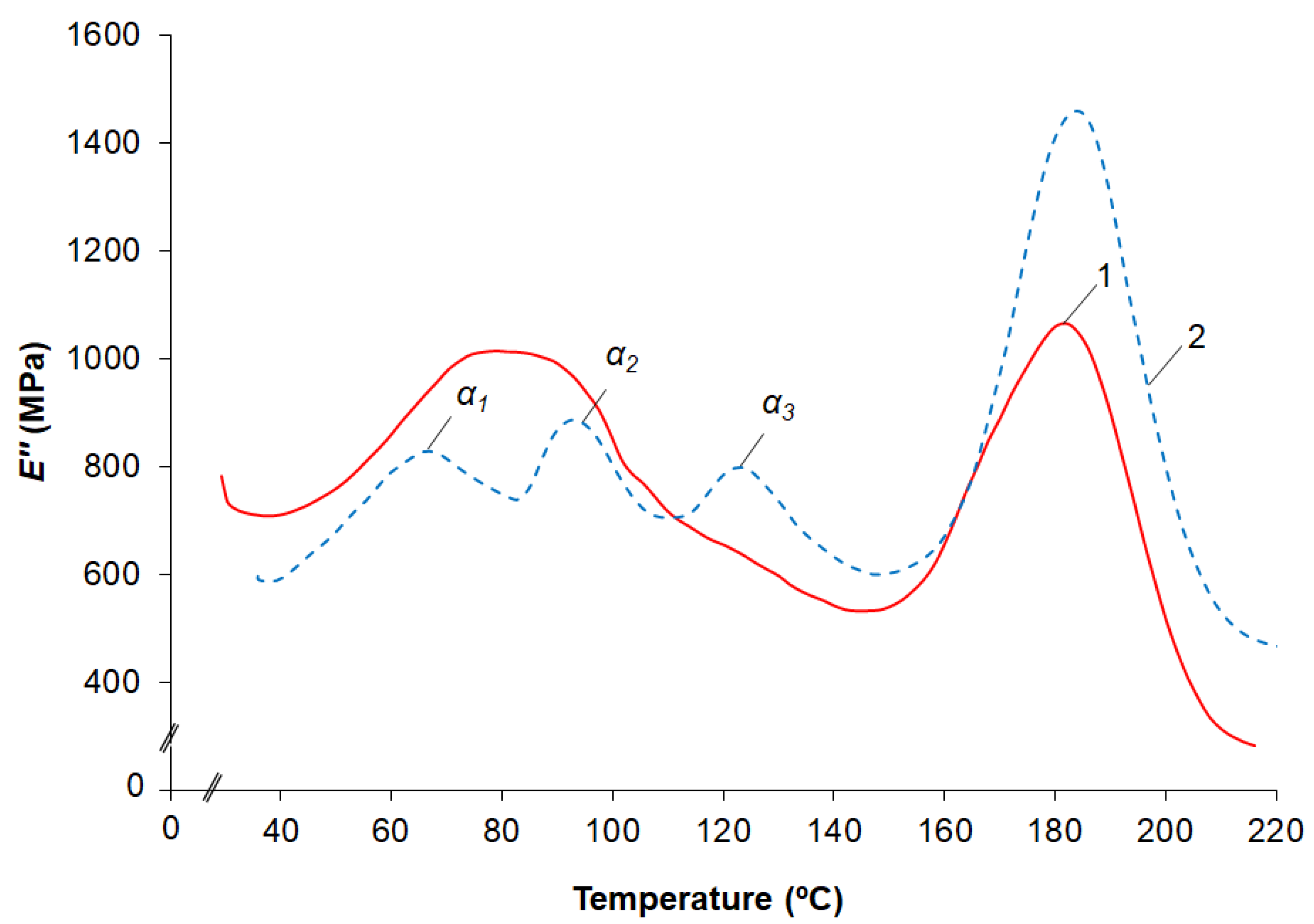 Figure 5. Temperature dependences of E″ of dried samples of fiberglass plastic of VPS-48/7781 with the VE-69 coating and the EP-0215 primer in the initial state (curve 1), after 3 years of exposure in the warm and humid climate of Sochi (curve 2). Temperature transitions are designated as α1–α3.