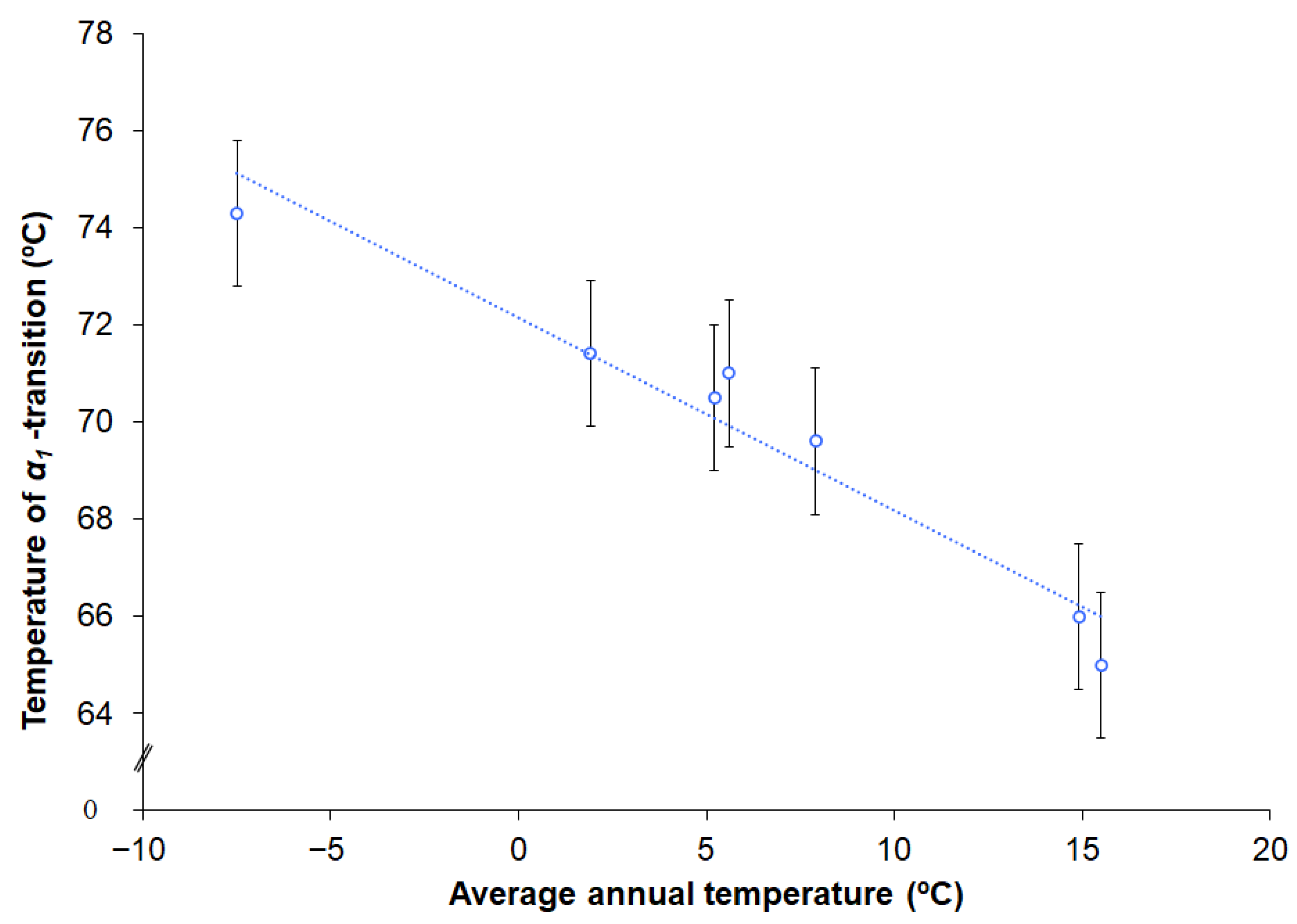 As a result of climatic exposure, the temperature of the α1-transition decreased from 1.7 °C after exposure in Yakutsk to 11.0 °C after exposure in Gelendzhik. Figure 6 shows that the temperature of the α1-transition, which is the glass transition temperature of fluoropolyurethane in VE-69, after 3 years of exposure, decreased in proportion to the average annual air temperature of the region. The total solar radiation dose during exposure also influenced the change in the temperature of the α1-transition, but monotonic proportionality was not observed.