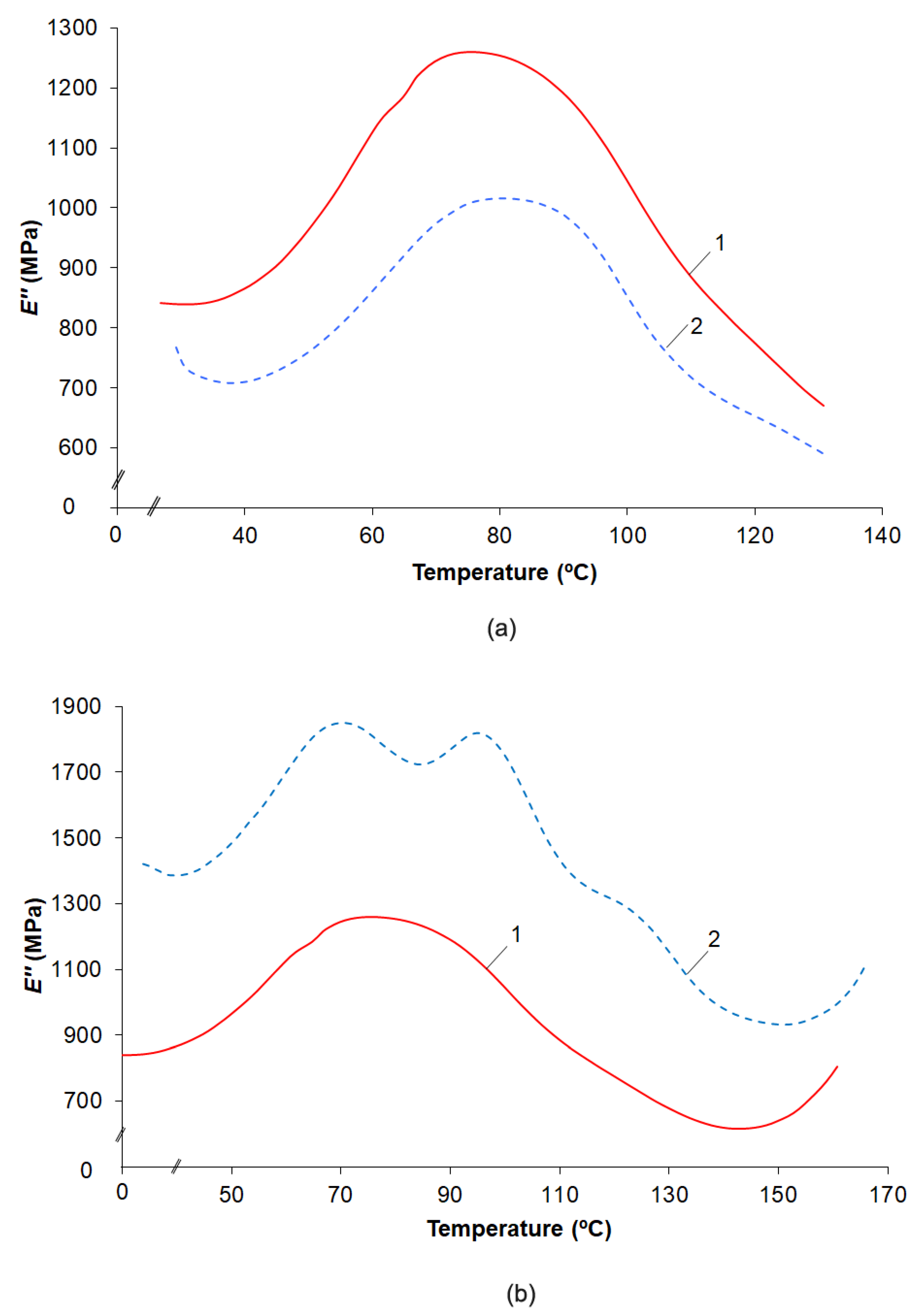 Figure 7. Temperature dependences of E″ fiberglass plastic of VPS-48/7781 with the VE-69 coating and the EP-0215 primer in the initial state (a) and after 3 years of exposure in Vladivostok (b) without pre-conditioning (curve 1) and after drying at 60 °C to a constant weight (curve 2).