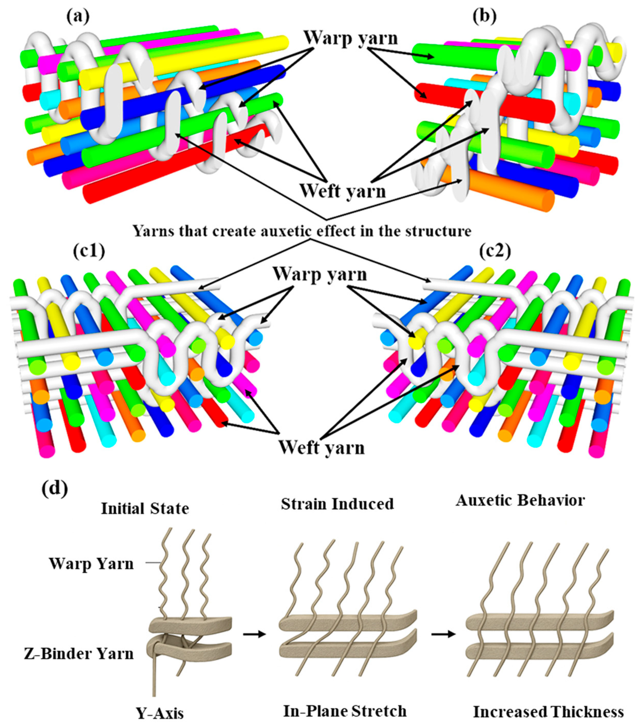 - Ullah, T.; Hussain, M.; Ali, M.; Umair, M. Auxetic behavior of 3D woven warp, weft and bi-directional interlock structures. J. Nat. Fibers 2023, 24, 2168823. [Google Scholar] [CrossRef]