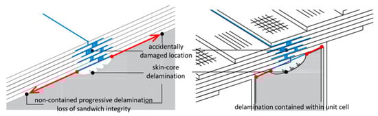 This internal transverse reinforcement structure endows TS panels with a significant crack-blocking capability (Figure 3). In traditional sandwich construction, accidental damage can trigger interfacial cracking between the skin and core owing to the absence of fibres in the direction of thickness, potentially resulting in catastrophic delamination. In contrast, the vertical reinforcement in a TS panel confines any crack to a single unit, effectively suppressing its propagation and substantially enhancing structural robustness []. Although TS panels have been field-proven in bridge applications, their mechanical behaviour is still only partially understood, and the publicly available literature contains mostly experimental investigations [,].