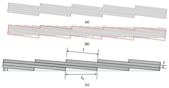 (a) TLN (tiled laminate with non-overlap configuration); (b) TLO (tiled laminate with overlap configuration) with the same volume as the corresponding TLN; (c) calculation scheme of inclination angle for TLN and TLO. The red line indicates the outline of the TLN in the diagram.