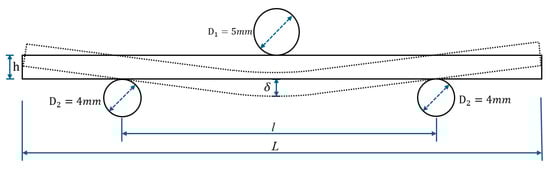Because the inclination angle limits the length of TL models, TLs with different inclination angles exhibit slightly different overall lengths (L) and spans (l). The width (w), thickness (h), length (L), and support span (l) for all TLs with different inclination angles are listed in Table 1. The ratio of h/L for every model greatly exceeds the ASTM D198 minimum requirement of 1/15. The three-point bending setup is illustrated in Figure 6. The two lower support noses are fixed, and a downward displacement is applied at midspan through the upper loading nose.