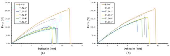 The load–deflection relationships of two sets of TLs with different inclination angles under three-point bending, obtained through numerical simulations, are shown in Figure 7, which also includes a plane-parallel (PP-0°) configuration as a reference to show the geometric effects. Based on the results, the mechanical behaviour of the elastic stage and non-linear stage is discussed.