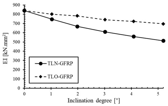 Relationship between bending stiffness (EI) and inclination angle of TLN-GFRP and TLO-GFRP.