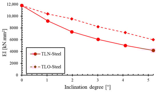 Relationship between bending stiffness (EI) and inclination angle of TLN-steel and TLO-steel.