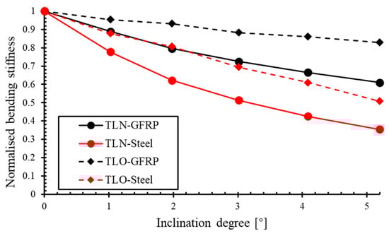Relationship between normalised bending stiffness and inclination angle of TLN-GFRP, TLO-GFRP, TLN-steel, and TLO-steel.