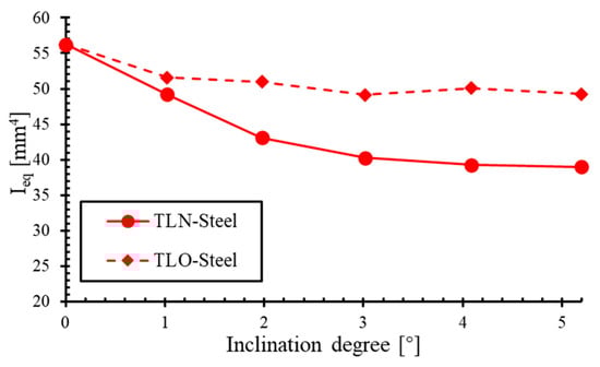 Relationship between equivalent moment of inertia () and inclination degree of TLN-steel and TLO-steel.