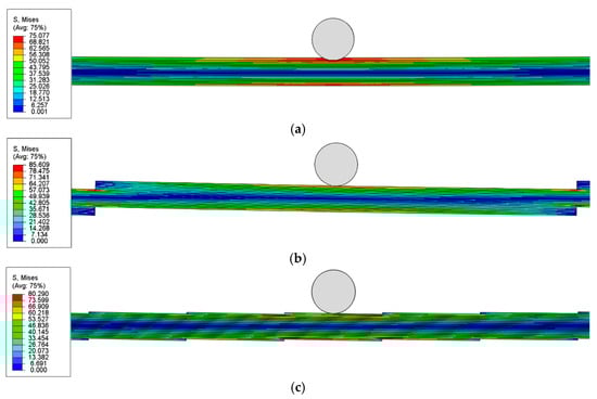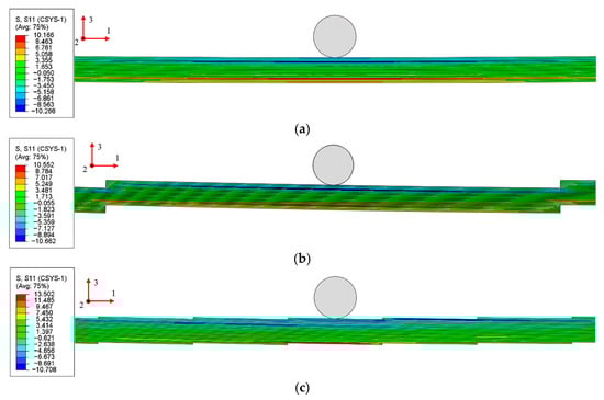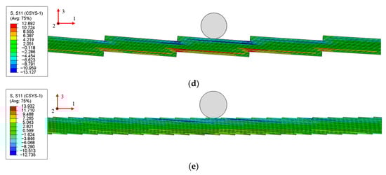 Because the stress distribution in tiled laminates under bending is complex and our primary concern is the local high-stress levels caused by the reduced sections, we focus on how the peak stress varies with inclination angle, geometric configuration, and material. To remove the effects caused by slight differences in span length, 10 models with an identical span, namely PP-Steel, TLN1°-Steel, TLO1°-Steel, TLN4°-Steel, TLO4°-Steel, PP-GFRP, TLN1°-GFRP, TLO1°-GFRP, TLN4°-GFRP, and TLO4°-GFRP, are selected to compare their elastic-stage stress distributions under three-point bending. To ensure a better contact between the loading and supporting noses and the TLs and to maintain stable loading, the loading and support noses are positioned not at the reduced sections but midway between two adjacent reduced sections.