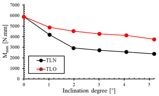 Due to slight variations in span lengths across TL specimens with different inclination angles, the ultimate midspan bending moment (Mmax = 0.25 × P × l) is employed to evaluate the ultimate flexural strength of TLs with varying inclination angles. Figure 16 illustrates the influence of the inclination angle on the ultimate midspan bending moment of TLs under three-point bending, with a particular emphasis on comparing the performance between TLNs and TLOs. The results demonstrate that both stacking configurations exhibit a pronounced decreasing trend in the ultimate midspan moment Mmax as the inclination angle increases from 1° to 5°.