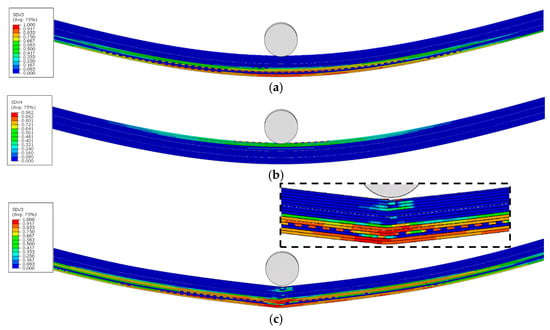 However, an examination of the three geometric configurations reveals fundamentally different ultimate failure mechanisms between PP and TL. For the PP configuration, ultimate failure results from the combined contribution of matrix compressive damage in the upper region and matrix tensile damage in the lower region of the midspan section. In contrast, both TLNs and TLOs at ultimate failure show no significant matrix compression damage in their upper regions. Instead, their ultimate failures are predominantly governed by the matrix tensile damage occurring in the 90° plies of the lower regions of reduced sections. A comparative analysis further reveals that TLN exhibits a more sudden failure, with a crack rapidly propagating and disrupting the structural integrity of the specimen, completely losing its flexural load-bearing capacity. Conversely, TLO demonstrates a more progressive failure, with a crack initiating within the interior of the specimen, enabling TLO to maintain a partial flexural load-bearing capacity even after damage initiation.