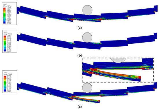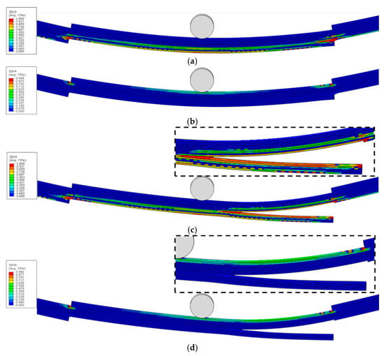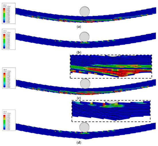 As analysed in Section 4.1.3 for stress distribution during the elastic stage, the TLO and TLN configurations, due to the stress concentration effects caused by their overlap, result in reduced sections on both sides of the midspan section being subjected to higher stress levels, thereby making this section the most vulnerable to failure. This suggests that these sections would serve as critical failure initiation regions. Figure 17, Figure 18, Figure 19, Figure 20 and Figure 21 show the matrix tension damage (SDV3) and matrix compression damage (SDV4) immediately before and after ultimate failure. It can be observed that all the TLs demonstrate failure initiation at the reduced sections near the loading nose. However, different geometric configurations and inclination angles significantly influence the damage initiation and progression patterns.