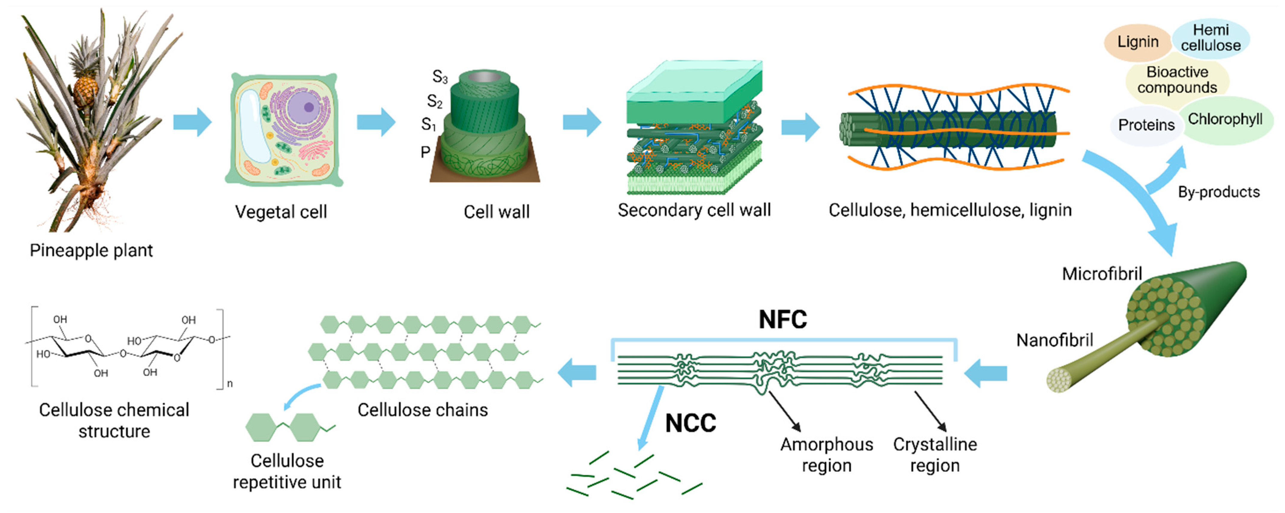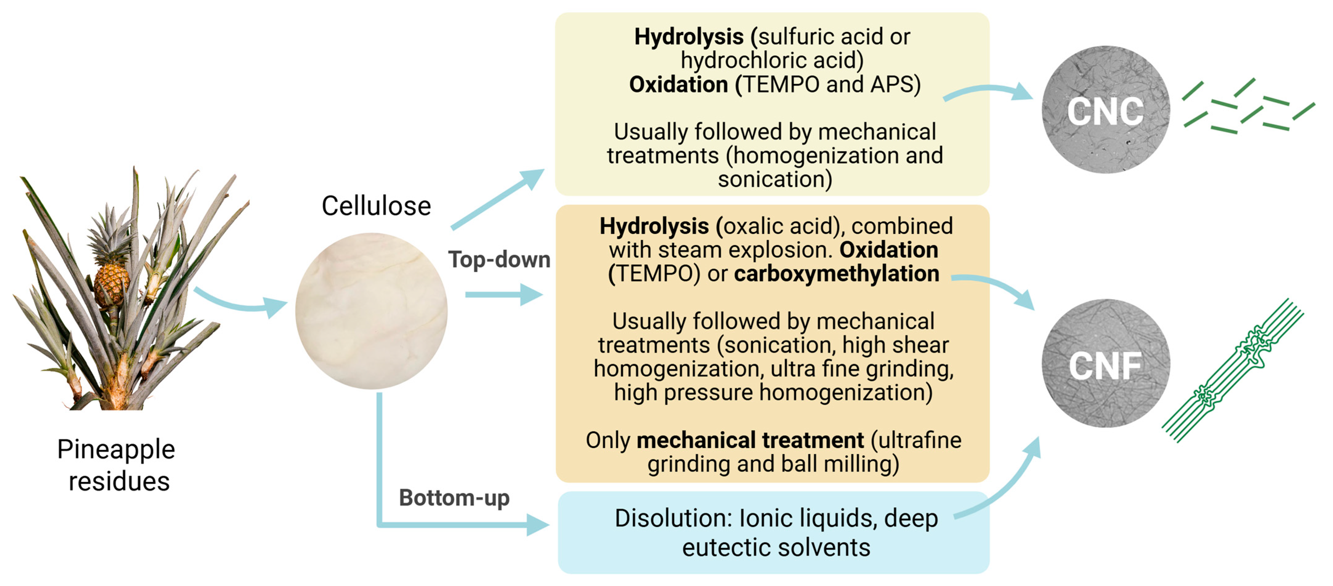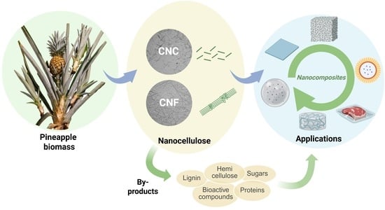 - Sarangi, P.K.; Srivastava, R.K.; Sahoo, U.K.; Singh, A.K.; Parikh, J.; Bansod, S.; Parsai, G.; Luqman, M.; Shadangi, K.P.; Diwan, D.; et al. Biotechnological innovations in nanocellulose production from waste biomass with a focus on pineapple waste. Chemosphere 2024, 349, 140833. [Google Scholar] [CrossRef] [PubMed]