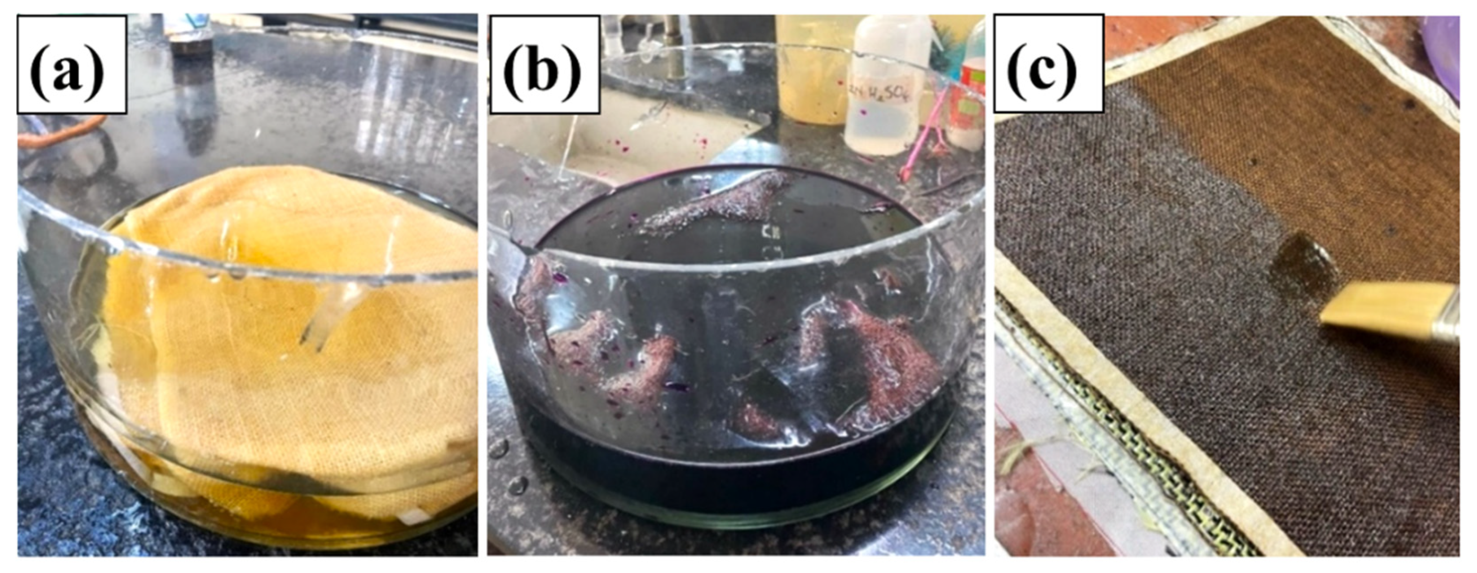 Figure 2. Chemical treatments: (a) 5% NaOH, (b) 0.5% KMnO4. (c) Hand lay-up method.