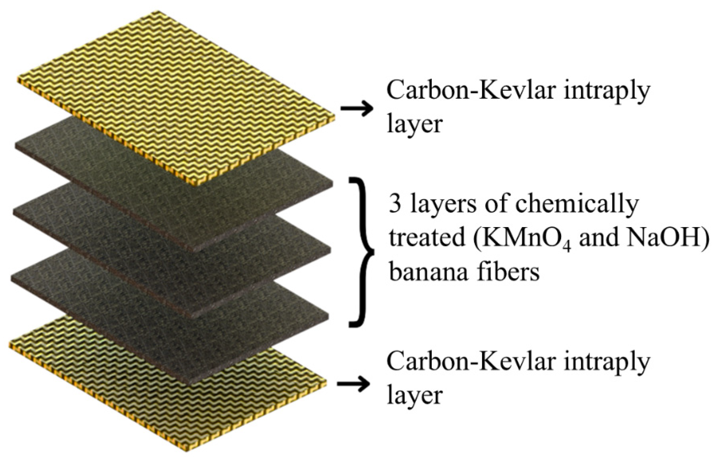 The hybrid laminate with dimensions 300 mm × 300 mm was fabricated using the hand lay-up method followed by compression moulding. The stacking sequence used was three layers of banana fibres sandwiched between intraply carbon–Kevlar surface layers, as presented in Figure 3.