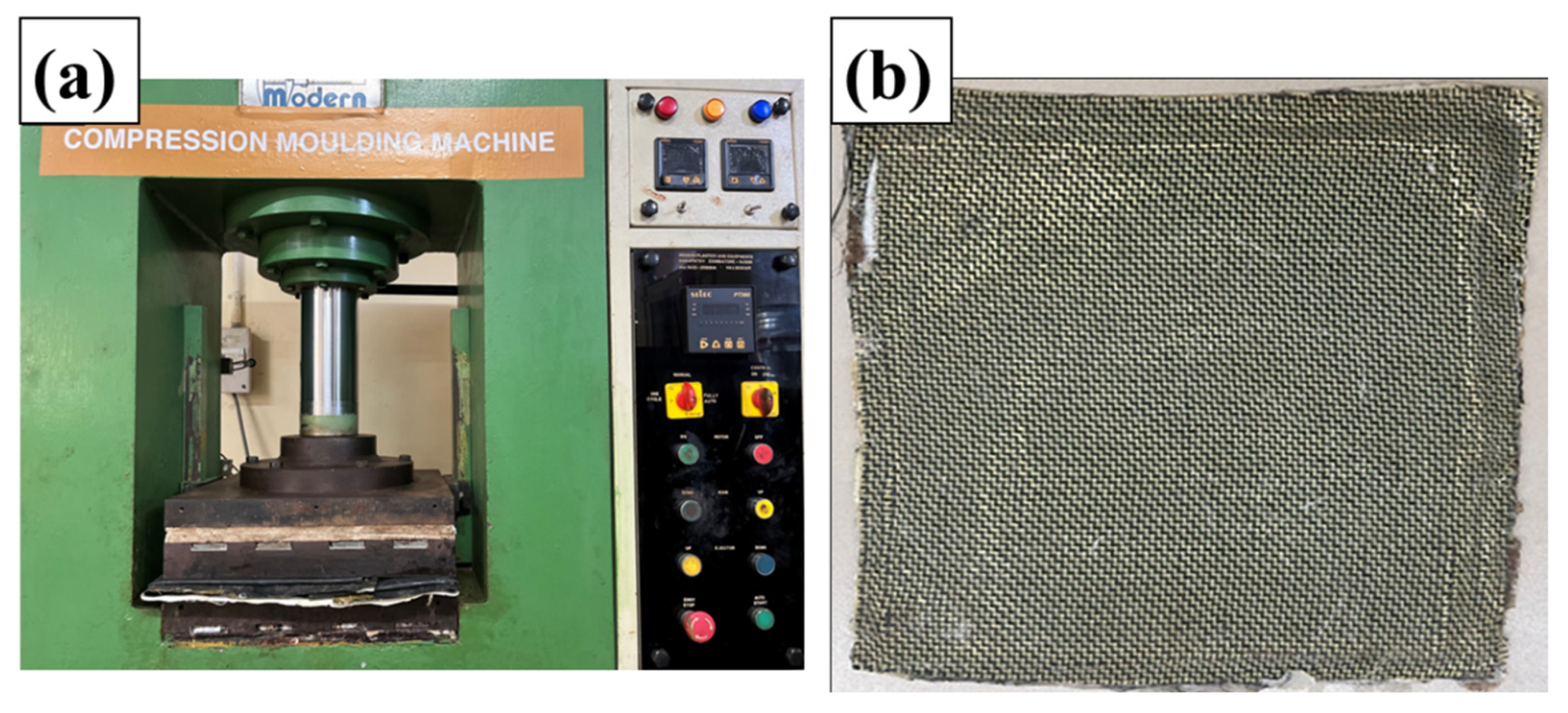 Figure 4. (a) Compression moulding. (b) Final composite laminate.