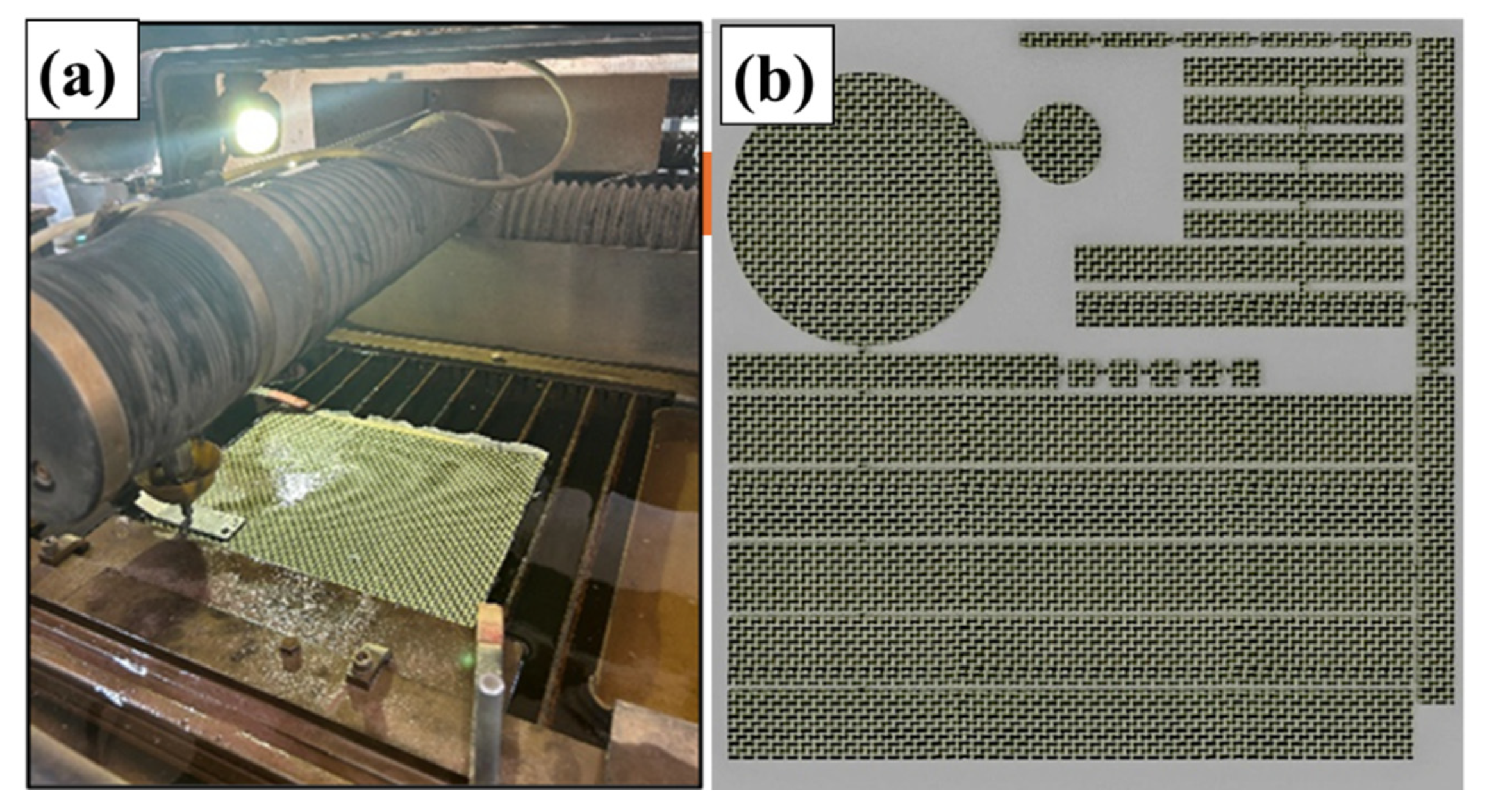 Figure 5. (a) Water jet cutting. (b) Final cut laminate.