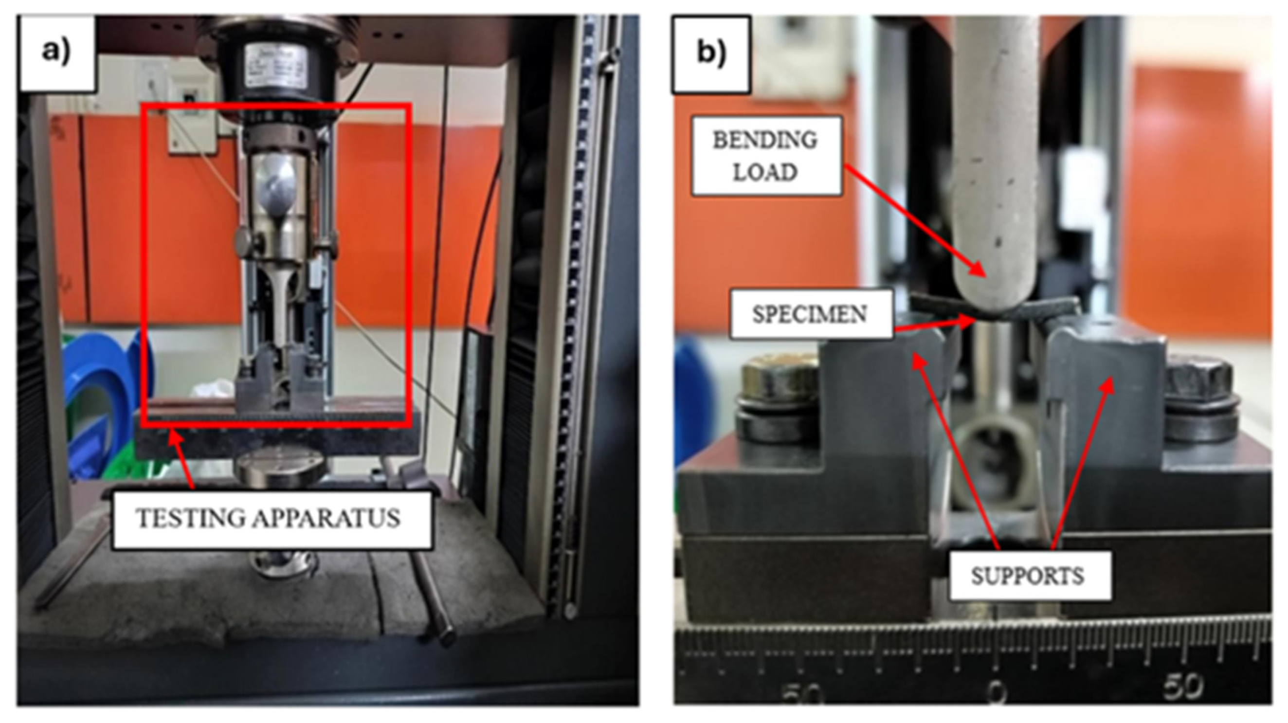 The shear strength between the laminae in a composite laminate is a significant concern in engineering due to the risk of delamination failure. The tests were conducted using a Zwick/Roell machine, which had a maximum working capacity of 20 kN, to evaluate the adhesion strength between carbon–Kevlar intraply and banana fibre layers of the composite. Specimens measuring 25 mm in length and 4.4 mm in width were prepared and tested following the ASTM D-2344 [33] standard for short-beam shear strength, as shown in Figure 6. The testing was conducted with a span length of 16 mm and a head displacement rate of 2 mm/min. By creating shear loads between layers, the machine determines the shear resistance, yielding important metrics on the material’s interlayer adhesion performance.