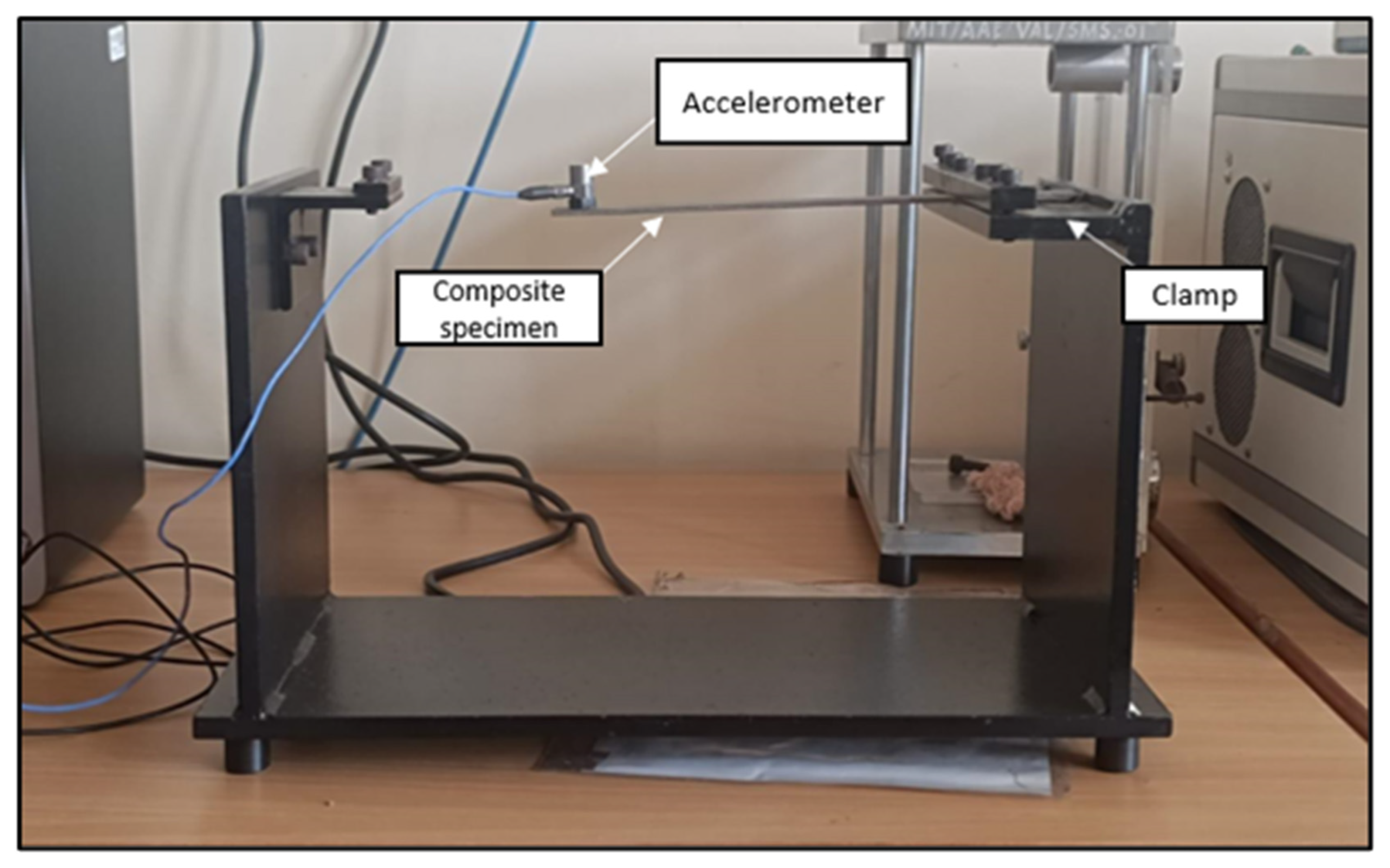 Vibrational analysis determines the damping ratio and natural frequency of a composite through vibration testing. This kind of testing is important for understanding a material’s ability to dissipate energy and withstand repeated vibrations and for identifying its natural frequencies, stiffness, and damping characteristics. Damping properties were evaluated according to ASTM E756-05 [34] standard. Specimens with dimensions of 250 mm × 25 mm were fixed at one end in a cantilever beam configuration, allowing the other end to remain unsupported (Figure 7 and Figure 8).