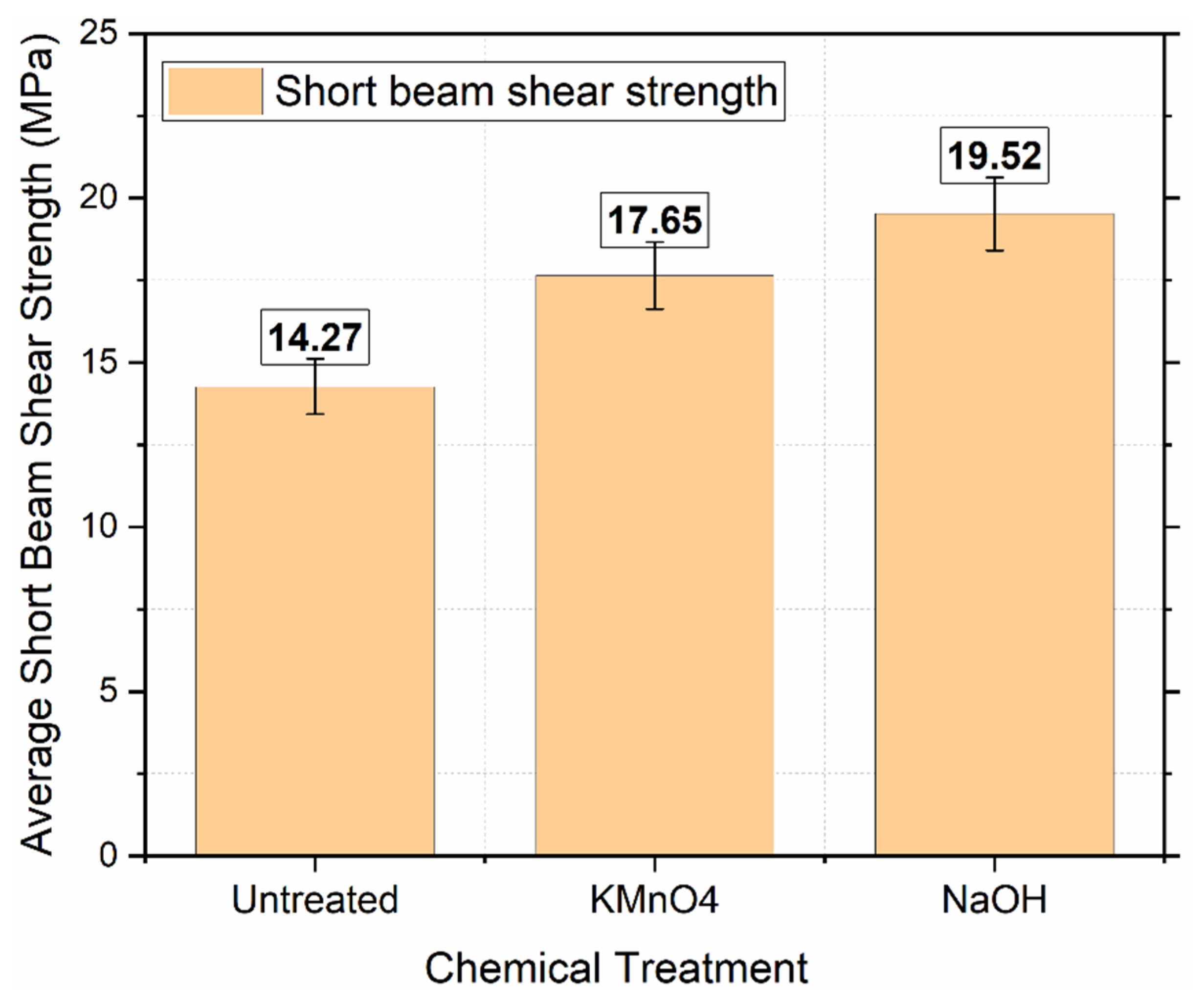 The untreated composite exhibited an interlaminar shear strength (ILSS) of 14.27 ± 1.72 MPa, reflecting the inherent challenge with natural fibres where weak fibre–matrix adhesion arises due to impurities like lignin and waxes on the fibre surface. Treatment with 0.5% KMnO4 increased the ILSS to 17.65 ± 1.84 MPa, a significant improvement attributed to the oxidative removal of surface contaminants, which enhanced fibre surface roughness and chemical compatibility with the epoxy matrix, promoting better interfacial bonding. The 5% NaOH treatment resulted in the highest ILSS of 19.52 ± 2.03 MPa, indicating superior removal of hemicellulose and lignin, increased exposure of hydroxyl groups, and greater surface roughness, all of which bolster fibre wettability and mechanical interlocking, leading to more effective stress transfer at the interface.